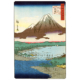 Auf dem Wasser treiben traditionelle Fischerboote, die der Szene Rhythmus und Leben verleihen, während die Gesamtstimmung des Blattes ruhig, harmonisch und meditativ bleibt. Diese Landschaft zählt zu den poetischsten Darstellungen des Fuji in Hiroshiges Werk und zeigt seine außergewöhnliche Fähigkeit, Naturbeobachtung mit lyrischem Ausdruck zu verbinden. Das Werk steht in der Tradition der japanischen Farbholzschnitte des ukiyo-e, die in der Edo- und Meiji-Zeit entstanden, und zählt zu den bedeutenden Beispielen der japanischen Holzschnittkunst ukiyo-e.
